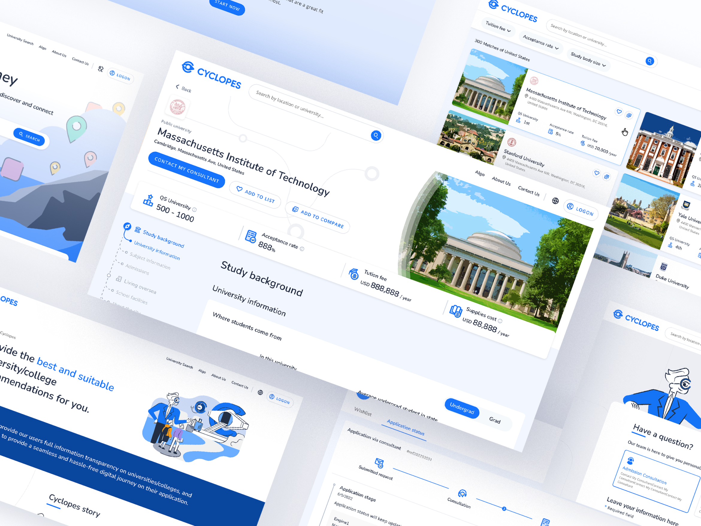 Cyclopes is a website that helps students find an overseas university based on their academic results and needs. It envisions providing reliable university information and free consultant service so that students can plan for their future without relying on ambiguous information from agencies. Besides, Cyclopes hopes to establish students' awareness of planning for their future earlier through storytelling.