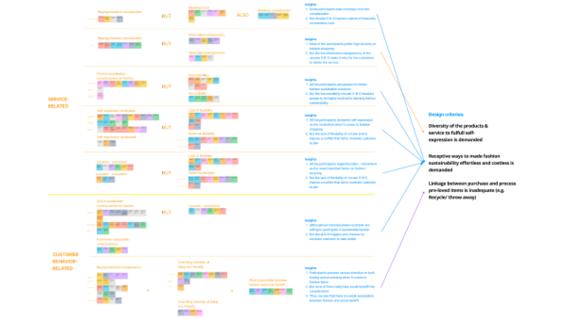 The interview results have gone through a 3-step analysis and synthesis to generate the final design criteria. The responses collected from the interview have been consolidated into raw data, followed by an empathy map analysis aiming to identify customers’ desires and barriers to initiating sustainable practices on fashion consumption. Then, we came up with three main design criteria.