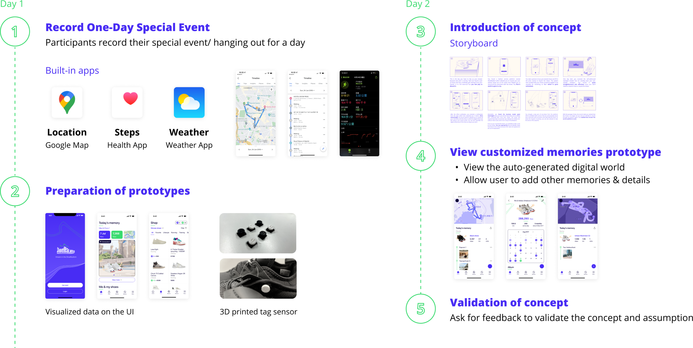 Invited participants to record data for a special event or a day they hang out with several existing apps. We will then visualize the data on ShoeRealism app and invite participants to test the prototype. Also, an AB test was conducted for the sensor part with a 3D-printed tag sensor prototype to assess their acceptance level toward the sensor's design.