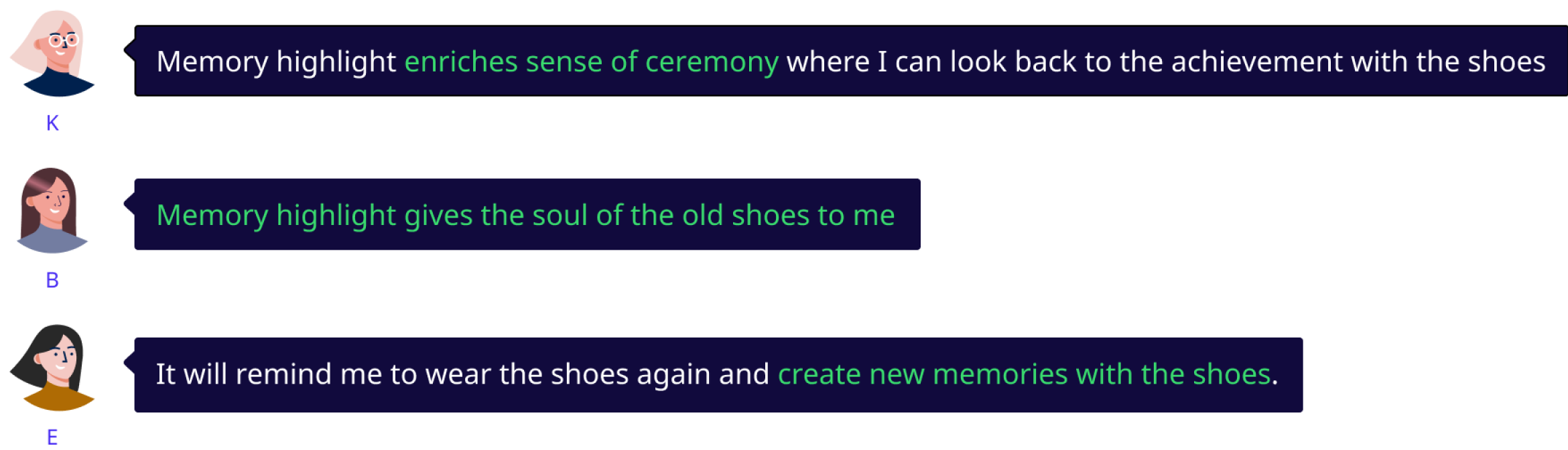 We found that some interviewees pointed out that they would purchase shoes with unique meanings to them. They could remember their experience with the shoes and may feel pity for recycling them. Thus, we see the possibility of using personal histories and memories as the potential materialities to be added in digital form to motivate users to detach from the physical items.