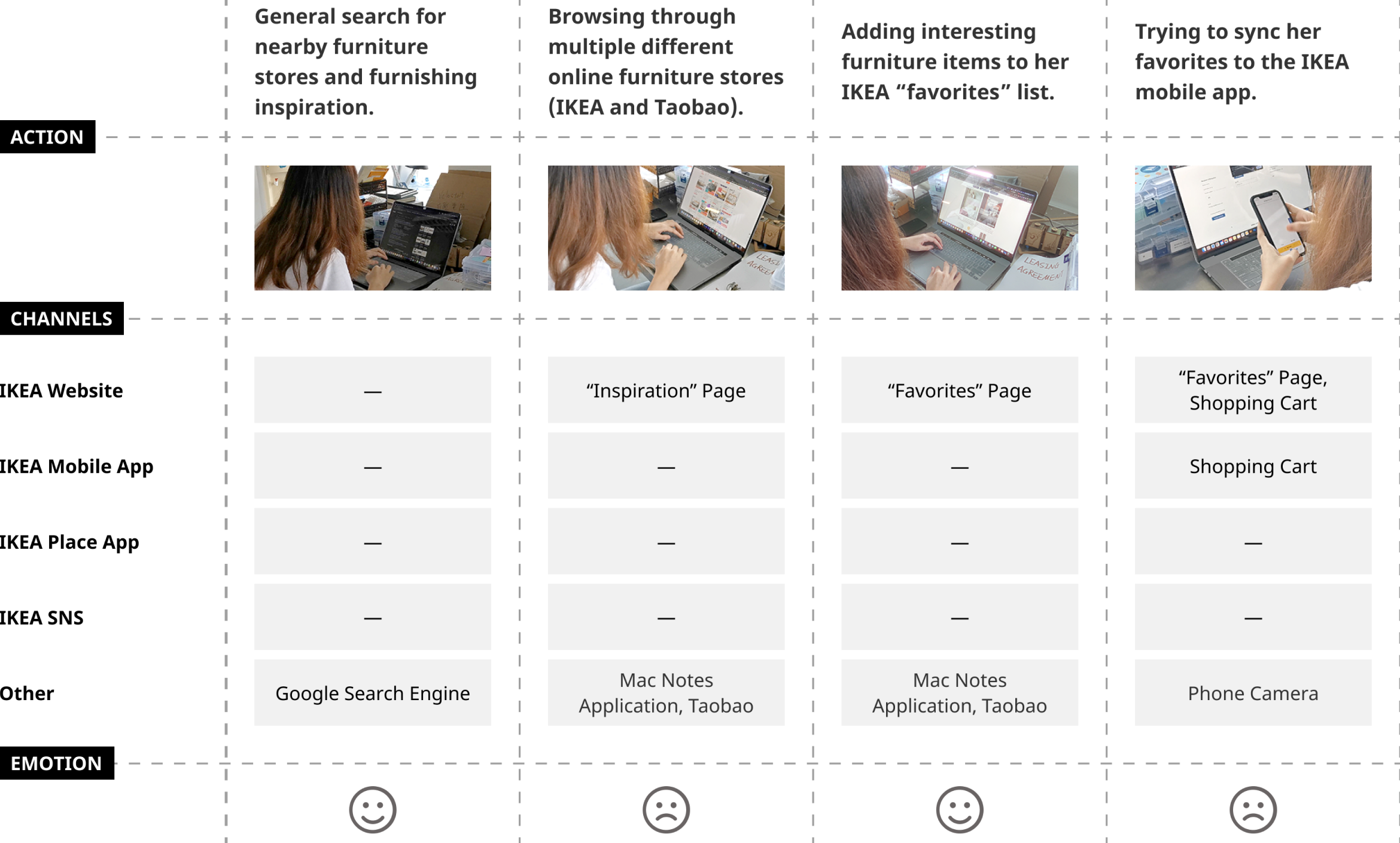 In the existing journey, the website can not serve the users' need for getting inspiration, and then the user will leave the website very quickly and decide to go to the store to check out more information, which is not user-friendly. Also, they do not notice a planning tool on the website that may allow them to play around with the IKEA products.