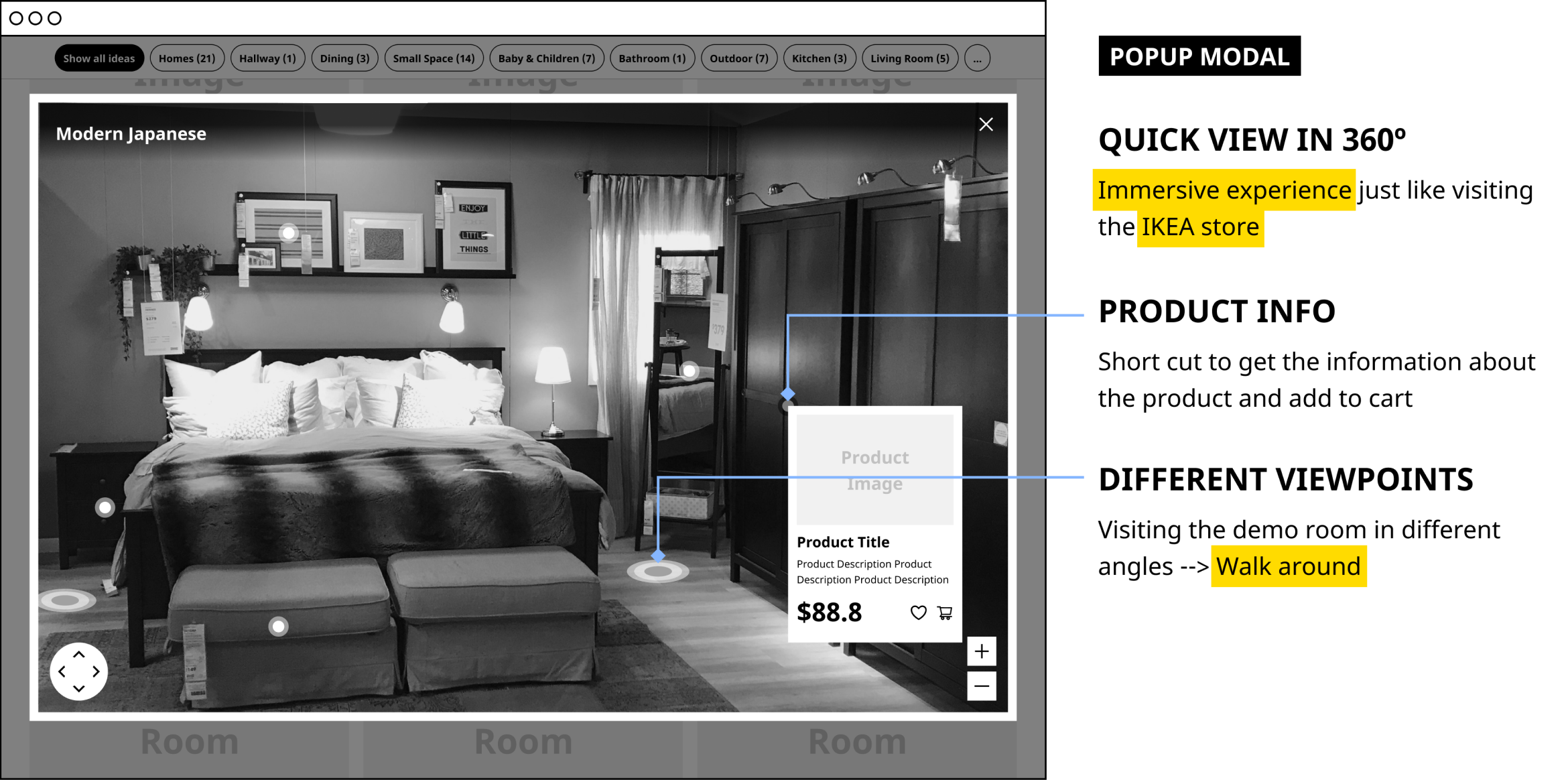 When clicking the Quick view in 360, a popup modal shows the interactive demo room. Users can have the immersive experience of visiting a demo room just like visiting the IKEA store. They can also try different viewpoints and get the product information from it.