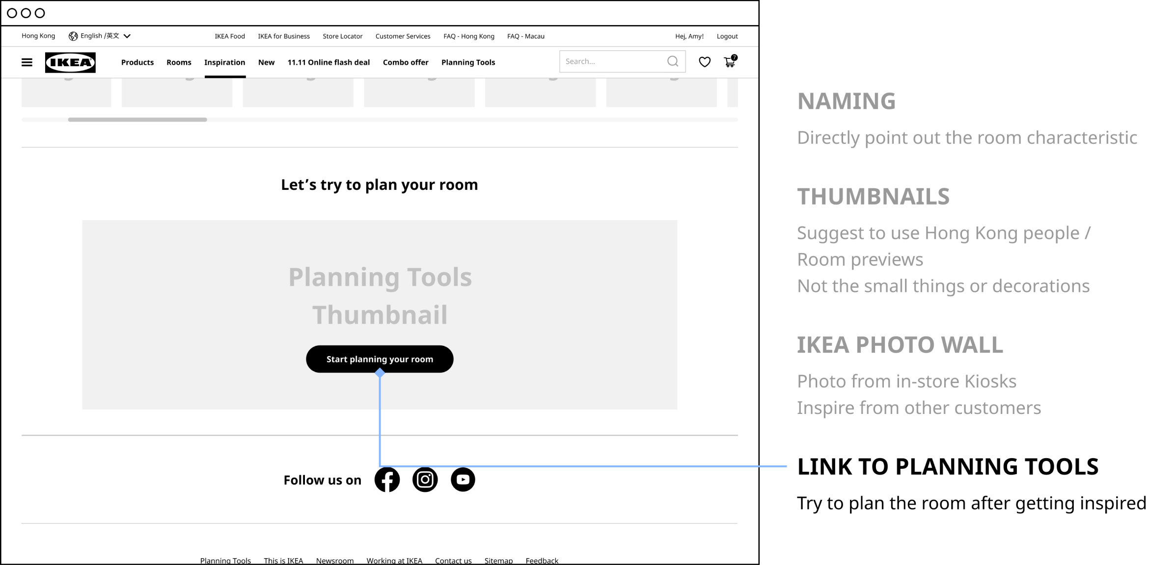 In the new flow, users also first visit the inspiration page, but now there are 360º Demo Rooms and IKEA photo wall that users can get more inspiration from both IKEA's and other customers' suggestions. After that, there is a shortcut to planning tools, so users can directly start designing their homes after being inspired. And there is a new Room Editor function to assist the user in planning for their design.