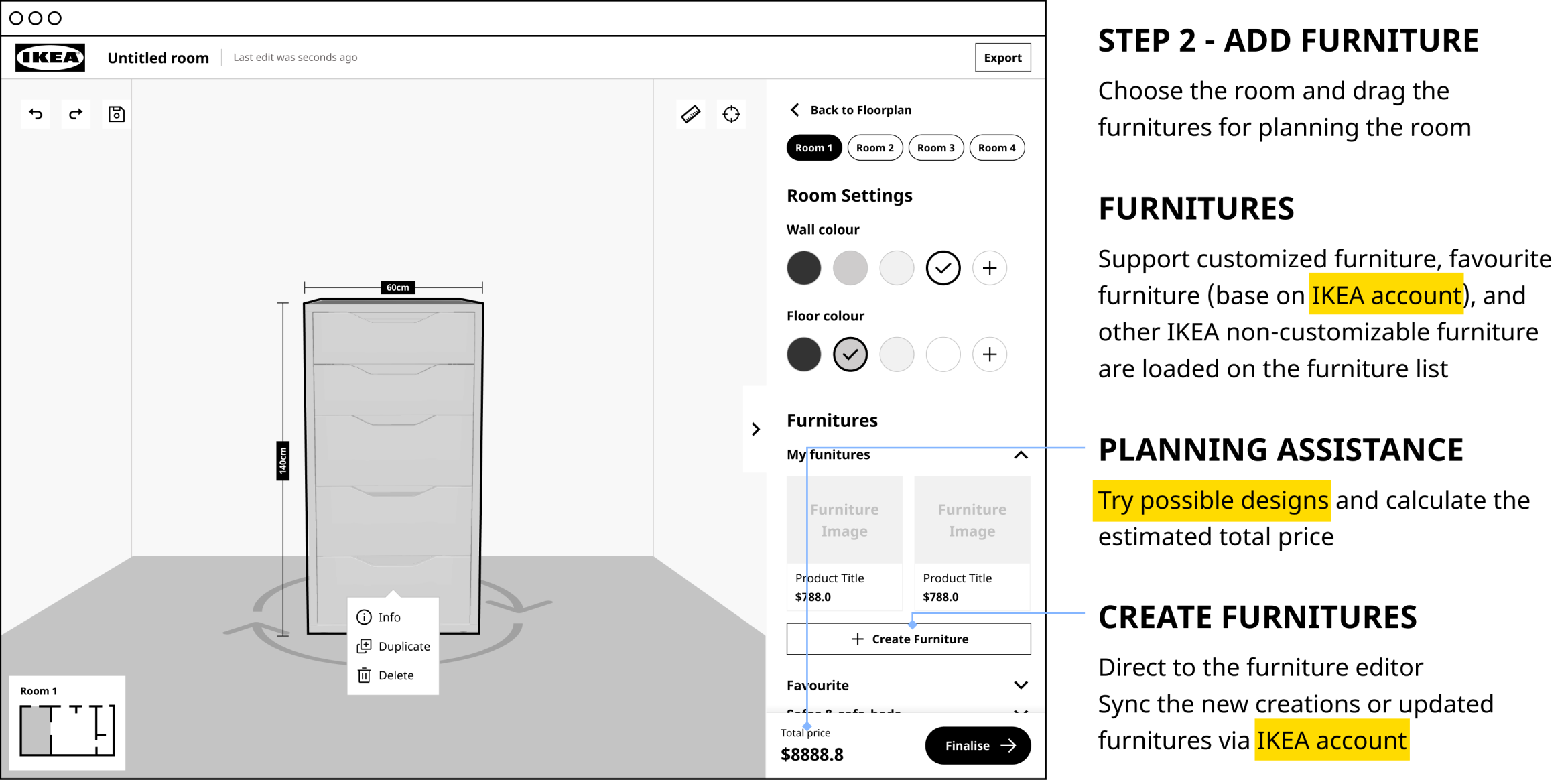 Next, they can drag the furniture room by room. Here, it will connect to the IKEA account to load the customized furniture and the furniture in the favorite list. While editing the room, they can try different combinations and possible changes for the furniture and get the estimated price to make sure their planning is under control and budget.