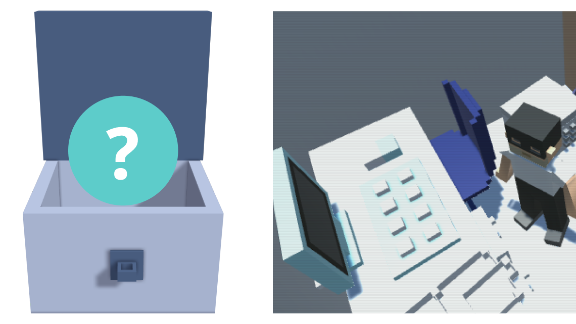 The thief interacts with objects, and Hacker navigates the thief. They explore the way to unlock the mysterious box, as well as loot valuable things they come across.