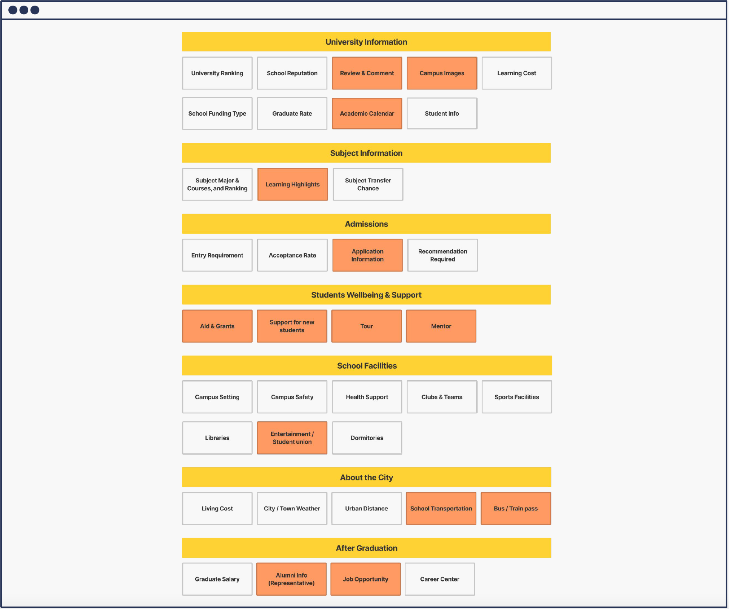From basic university and subject information (Before) to university and surrounding facilities (During), and the career (After) at last.