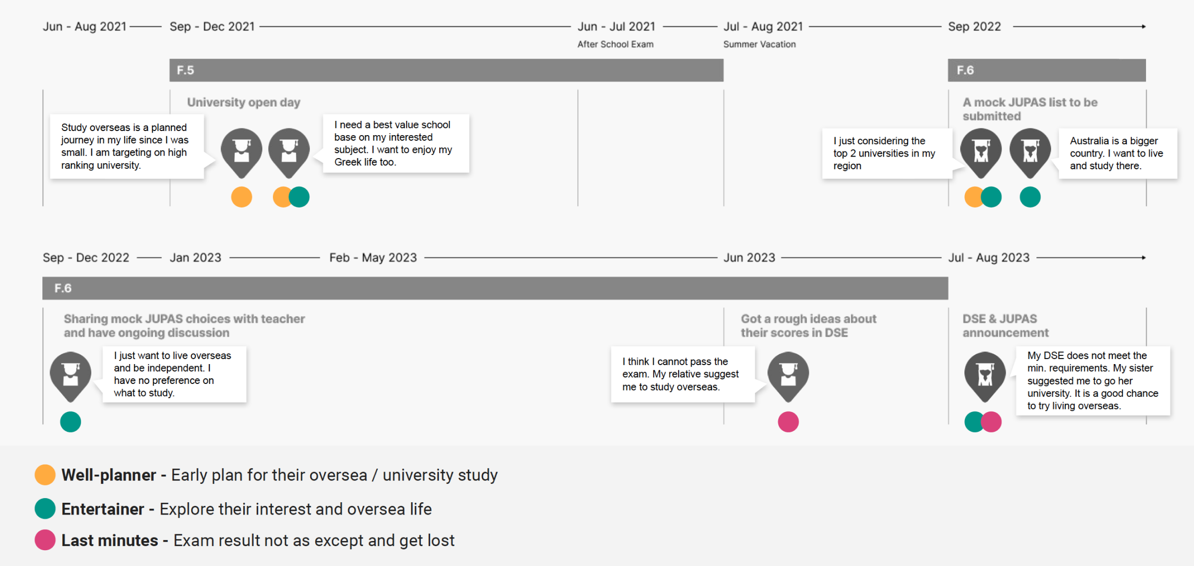 - The common way they consider and organize data is to “Imagine the path to get throught the overseas university. Before, during and after”.