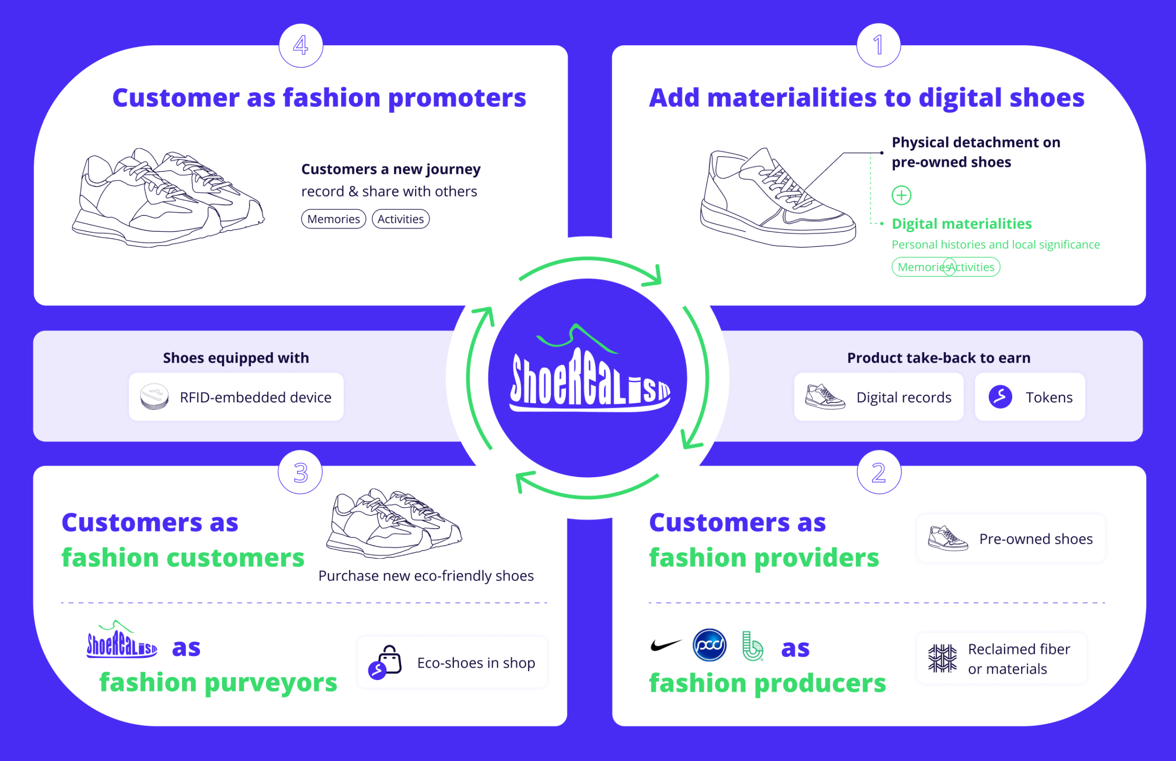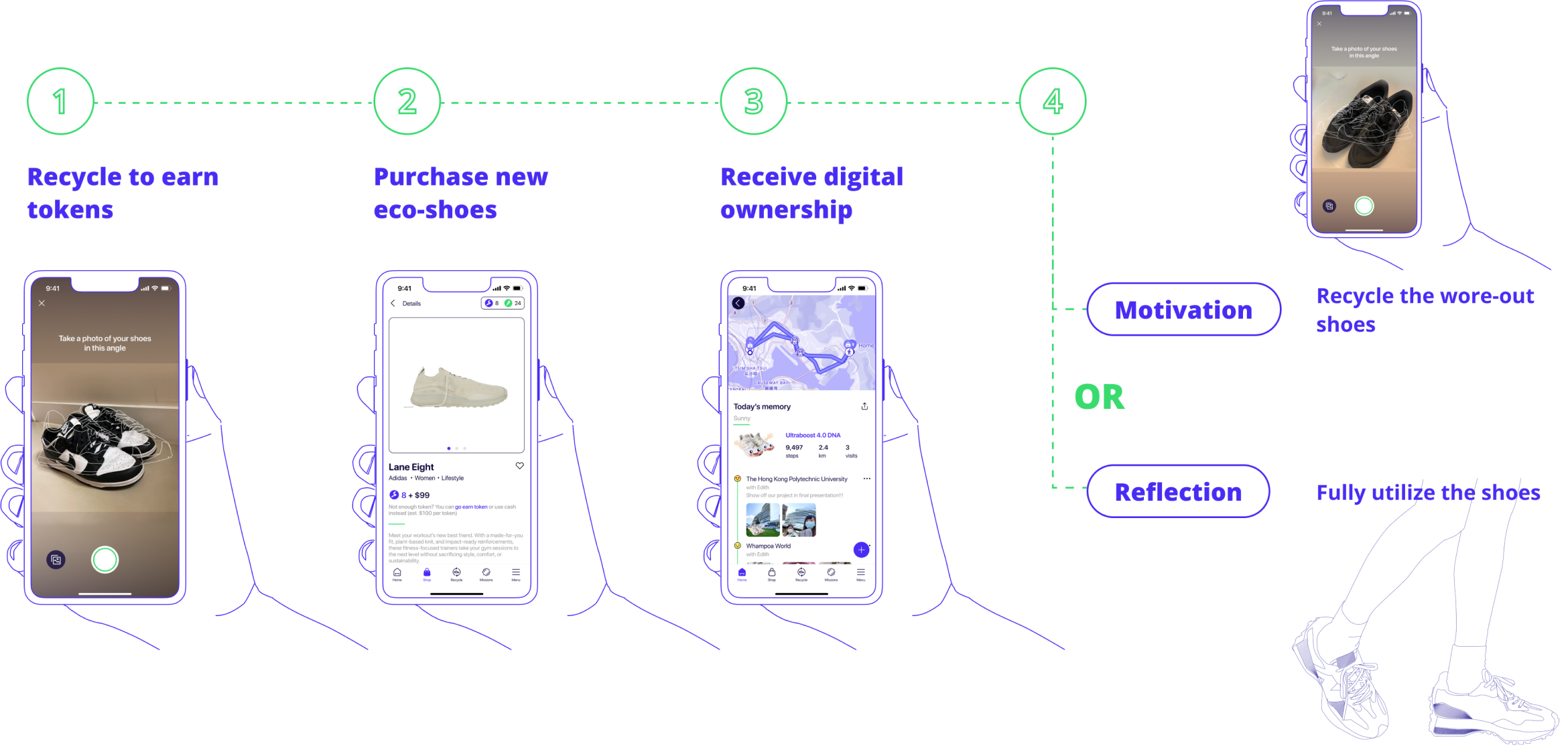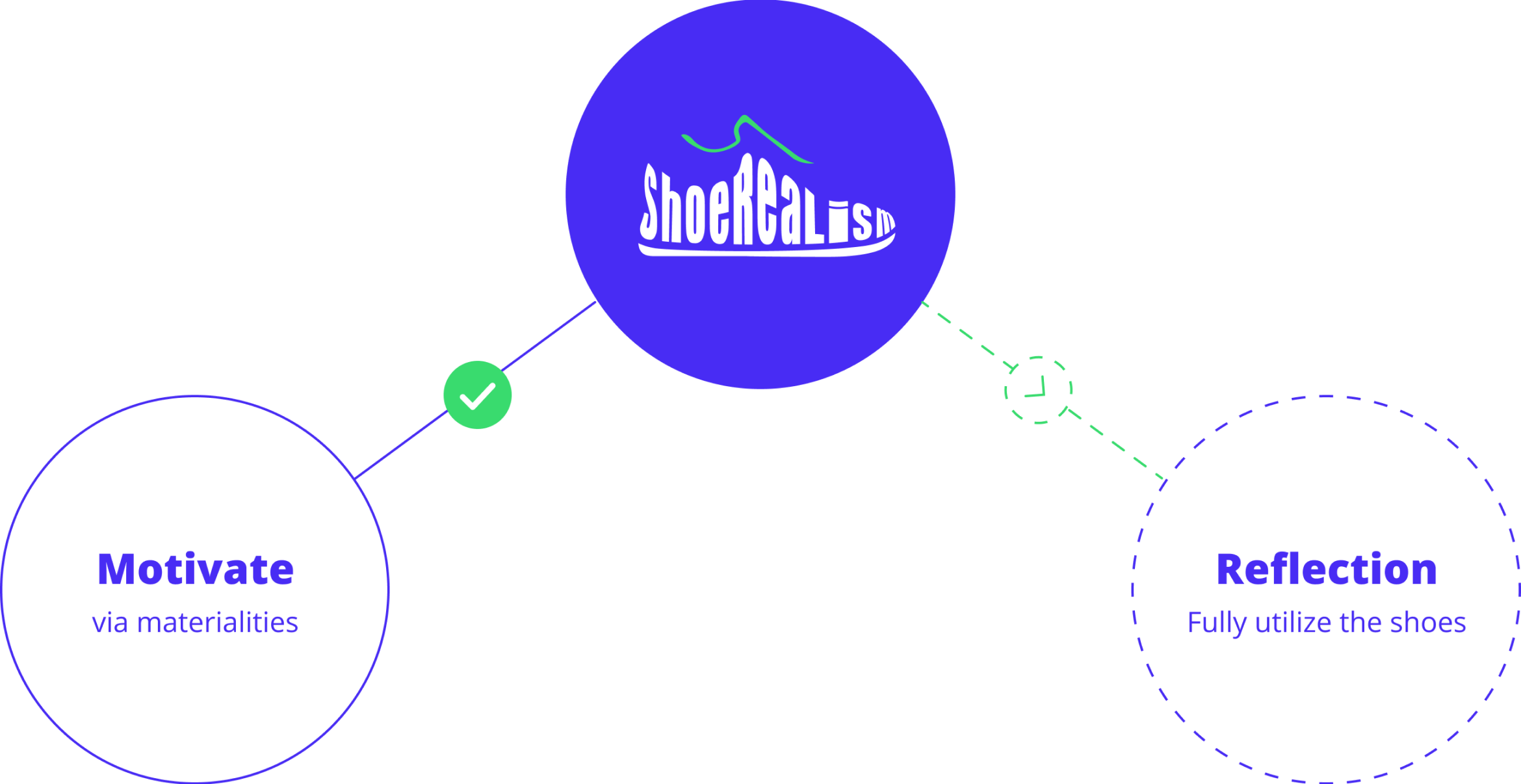 - Focus on providing a space for reflection on consumption where users can choose to recycle the pre-owned shoes or to fully utilize the shoes before recycling it