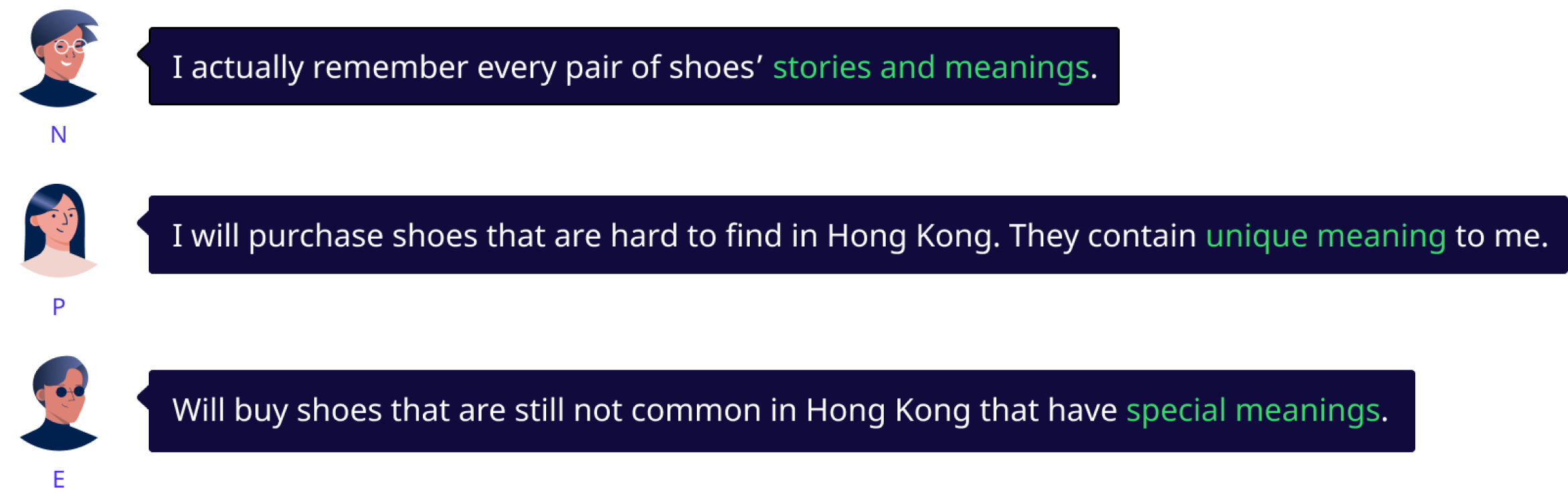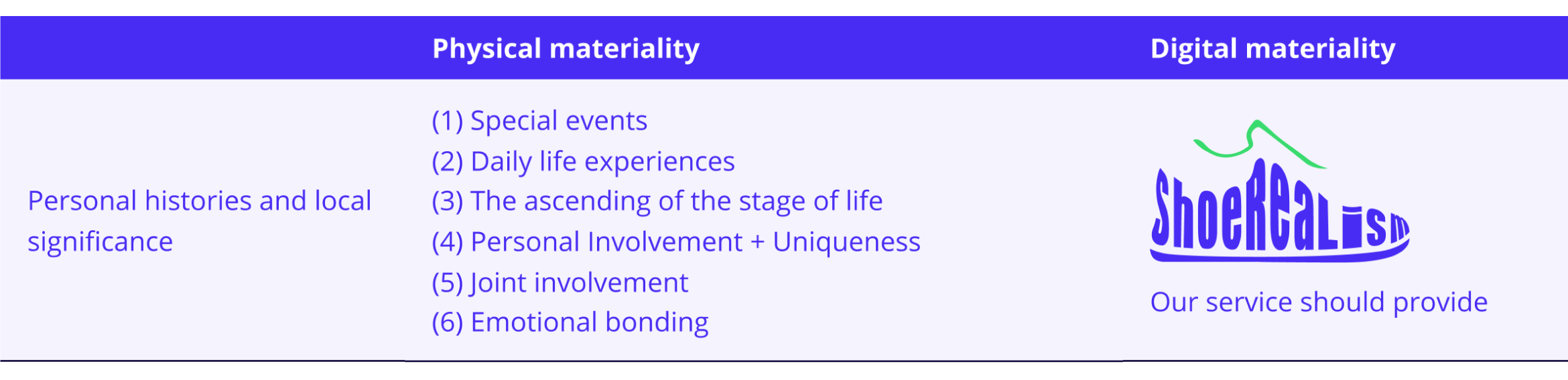We found that some interviewees pointed out that they would purchase shoes with unique meanings to them. They could remember their experience with the shoes and may feel pity for recycling them. Thus, we see the possibility of using personal histories and memories as the potential materialities to be added in digital form to motivate users to detach from the physical items.