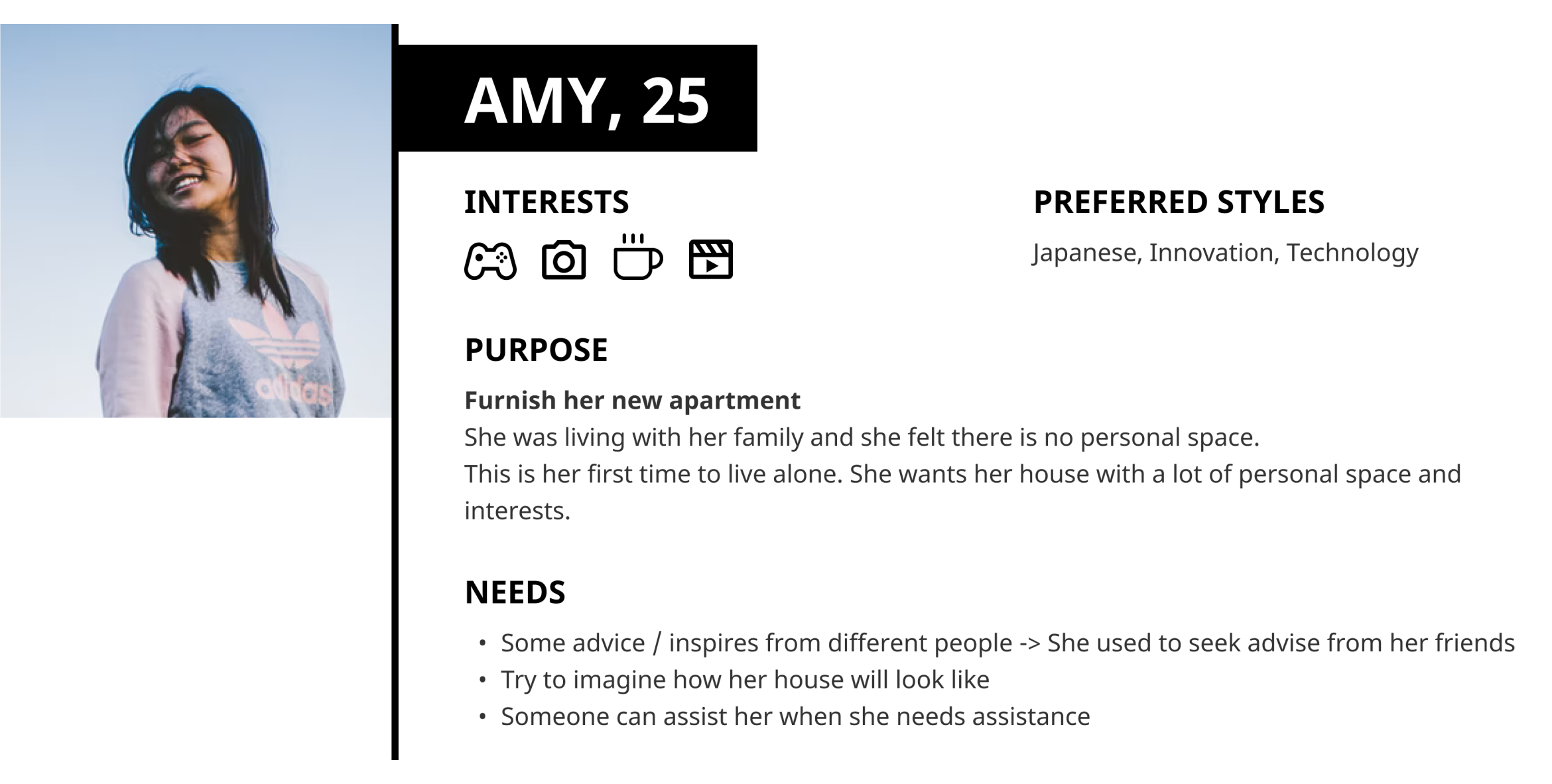 Therefore, the goal for the upcoming enhancement is to provide better insight and research experience for our target users. As the user used to ask friends' advice, we try to make IKEA as the users' friend to give insight and assist them in designing their home.
