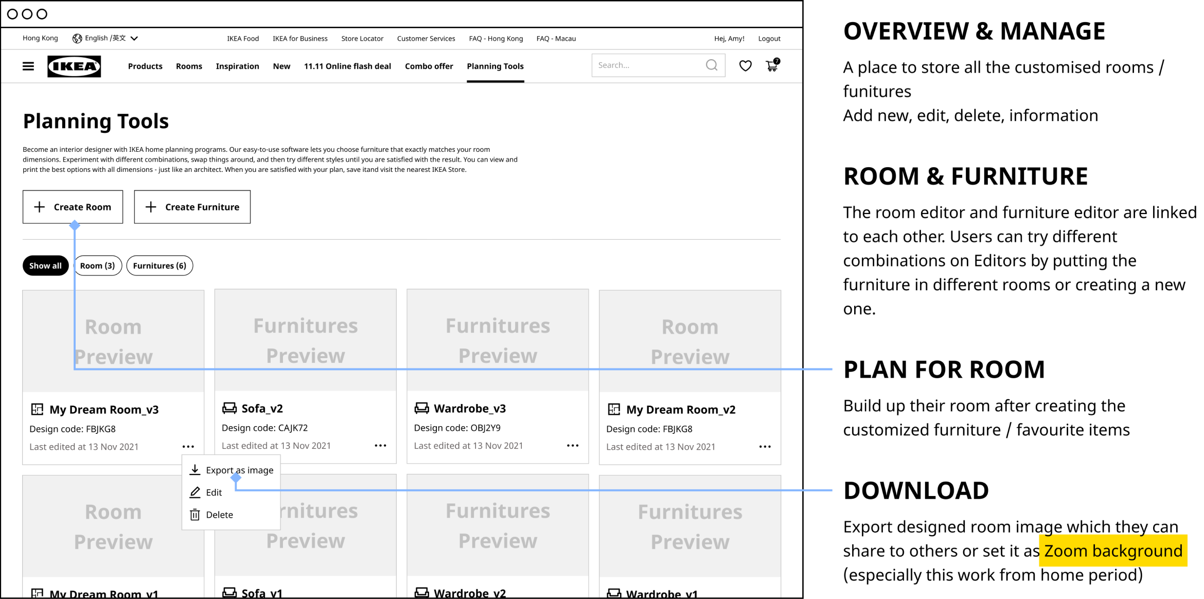 On the Planning tools page, all designs will show here. After they buildup some designs, they can also download them as an image to imagine the room as a home. For example, set it as a Zoom background, especially this work from home period.